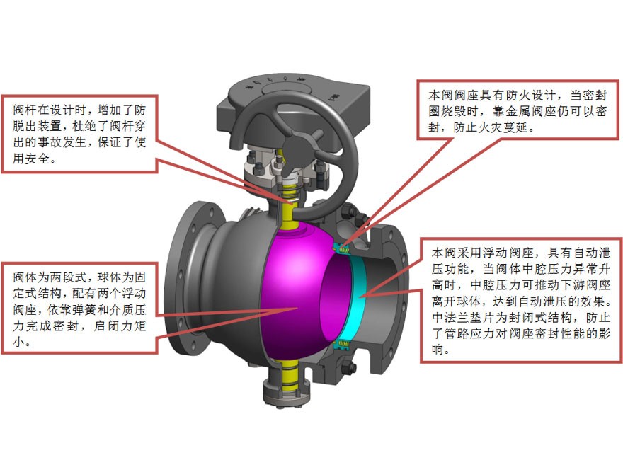 球閥是用帶有圓形通孔的球體作為啟閉件,在閥桿驅動下球體圍繞閥桿中心作0~90°旋轉,完成啟閉功能,體積小、重量輕、結構簡單,本閥球體為固定式結構,閥座相對球體具有浮動功能,在介質壓力作用下能保證進口密封性能;